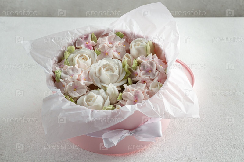 Зефирный букет цветов в розовой коробке на сером фоне