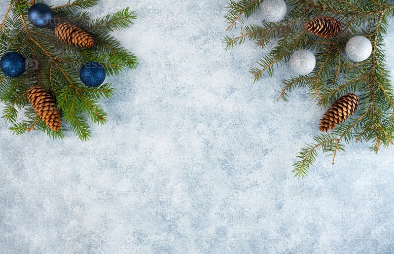 Елочные шары со свечами, с шишками на сером фоне. Выборочный фокус. Место для копирования. вид сверху. Рождество, новогодняя открытка. новогодний фон