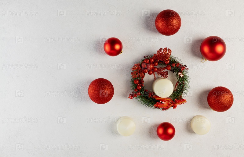 Красные елочные шары со свечами на светлом фоне. Выборочный фокус. Место для копирования. вид сверху