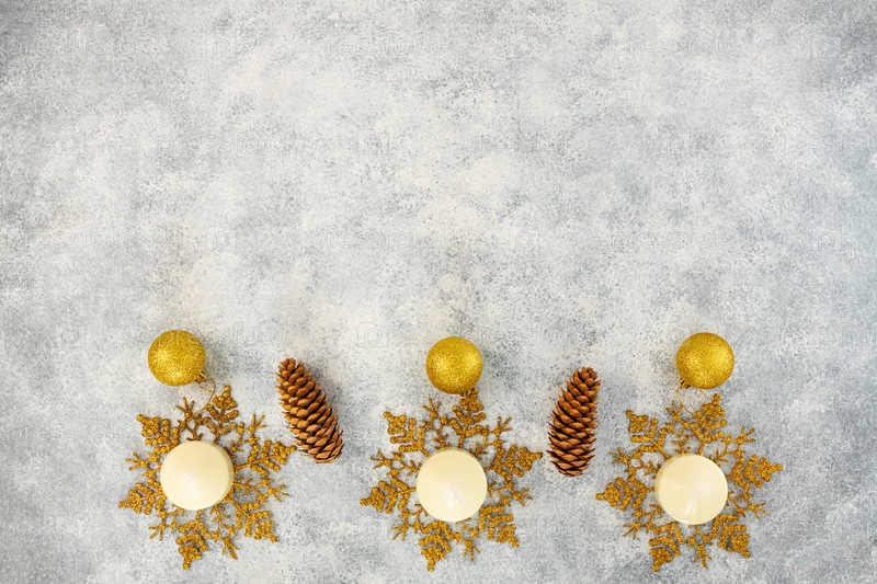 Рождественские снежинки, шары со свечами, с шишками на светлом фоне. Выборочный фокус. Место для копирования. вид сверху. Рождество, новогодняя открытка