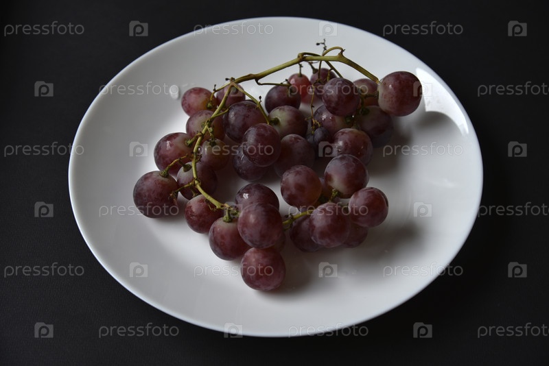 Вкусный черный виноград на белой тарелке. Крупный виноград на черном фоне. Вкусный фруктовый завтрак