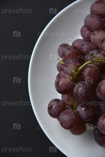 Вкусный черный виноград на белой тарелке. Крупный виноград на черном фоне. Вкусный фруктовый завтрак