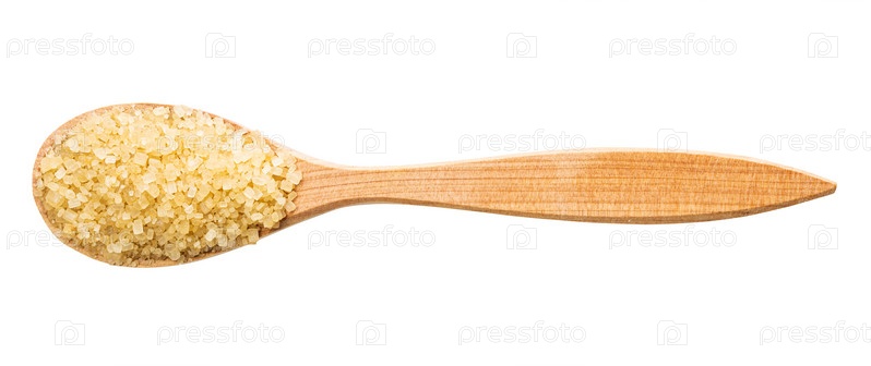 Вид на коричневый тростниковый сахар демерара в деревянной ложке