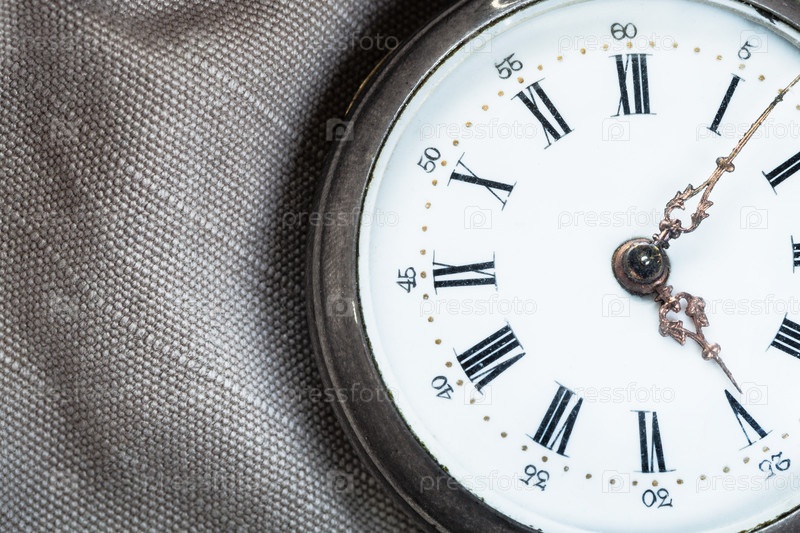Циферблат старинных карманных часов на сером текстиле