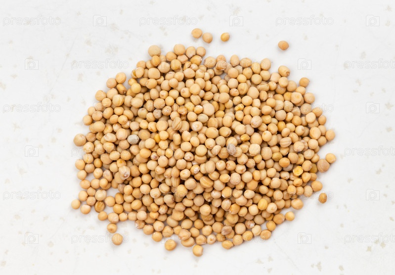 Куча семян белой горчицы крупным планом на сером