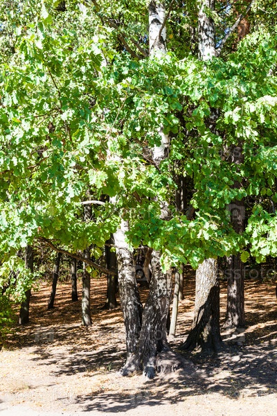 Стволы березы и дубовые листья в городском парке