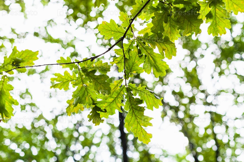 Дубовая веточка с зелеными листьями и размытым лесом