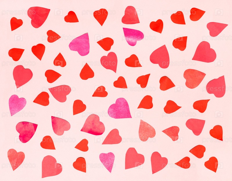 Сердечки, вырезанные из цветной бумаги на розовой бумаге для пастели