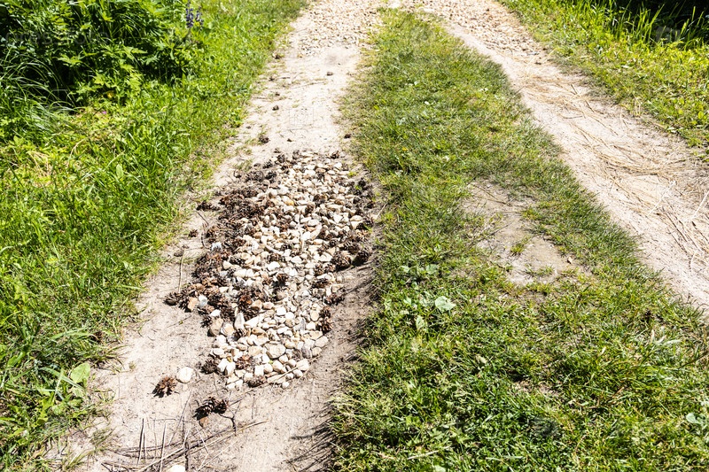 Яма на грунтовой дороге, заполненная щебнем и сосновыми шишками