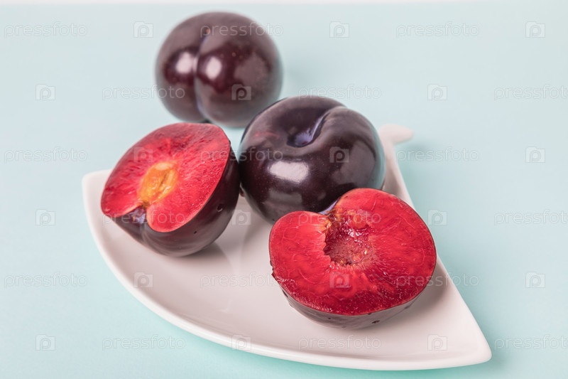 На белом блюдце большая слива, разрезанная пополам, а рядом целая слива