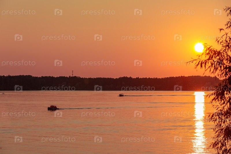 Лодка тянет человека по волнам на вейкборде. Вейкбординг на закате