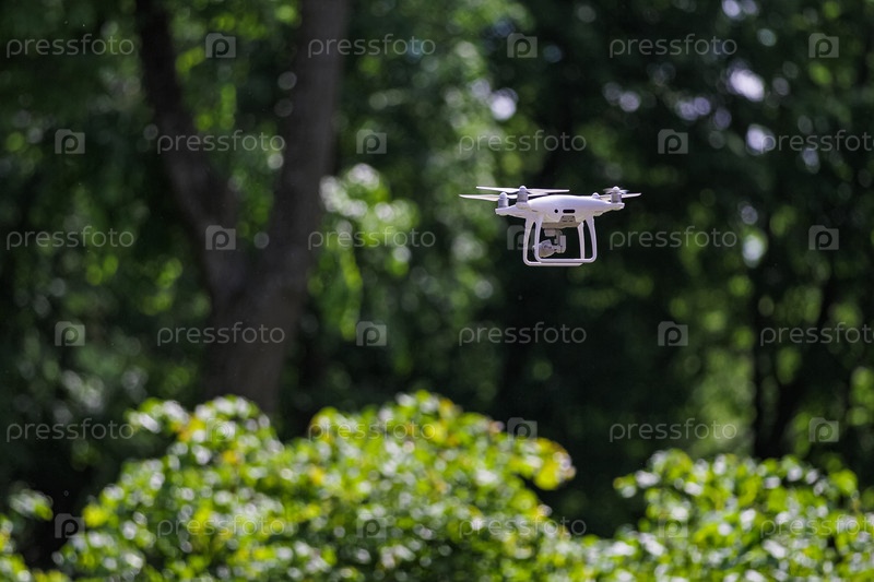Квадрокоптер с цифровой камерой завис над кустами в лесу