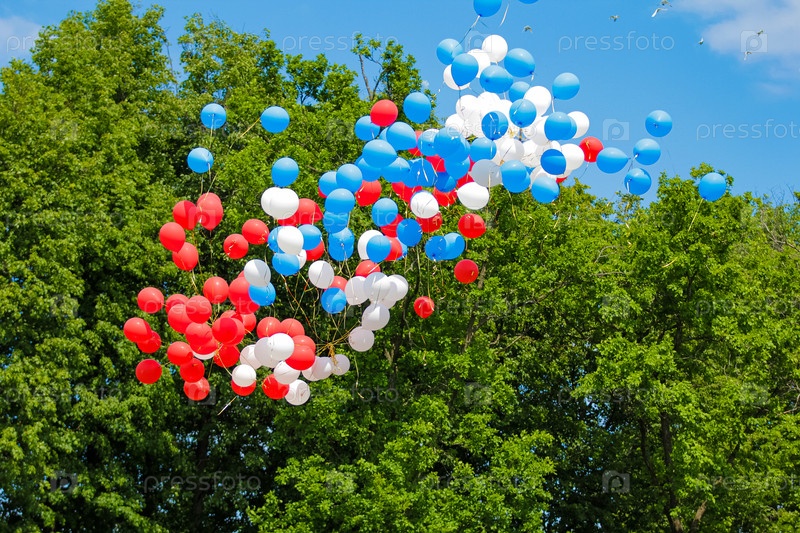 Связки разноцветных воздушных шаров взлетают в небо над лесом