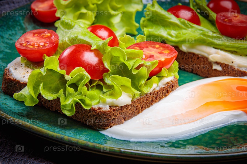 Сэндвич с черным хлебом с салатом из плавленого сыра и помидорами на зеленой тарелке