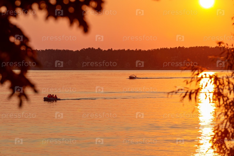 Лодка тянет человека по волнам на вейкборде. Вейкбординг на закате