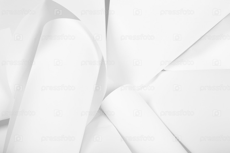 Белые листы офисной бумаги скручены и разбросаны. Бумажный белый абстрактный фон
