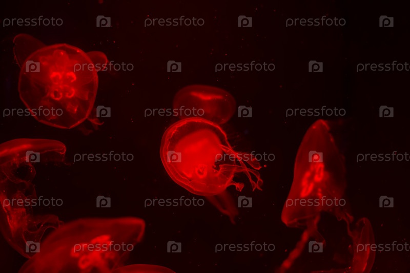 Медуза на черном фоне. Медуза подсвечена красным светом