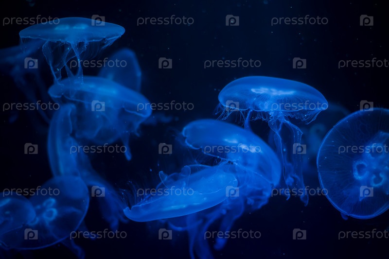 Медуза на черном фоне. Медуза выделена голубым светом