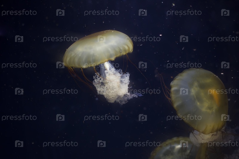 Две желтые медузы на черном фоне на черном фоне