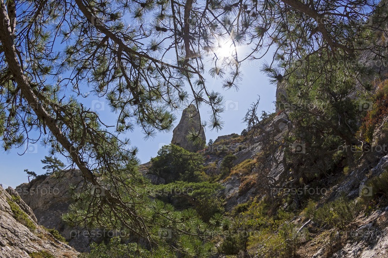 Вид на скалу "Чертов палец" из небольшого ущелья. Крым, Гора Сокол (между Судаком и Новым Светом)