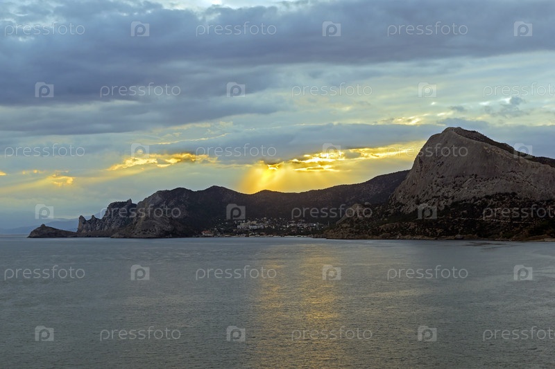 Закат солнца на черноморском побережье Крыма. Вид с вершины мыса Алчак на запад, в сторону Нового Света