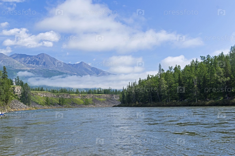 Красивые многоуровневые облака на фоне гор. Вид с береге реки Ока Саянская. Восточный Саян, Бурятия, Сибирь, Россия