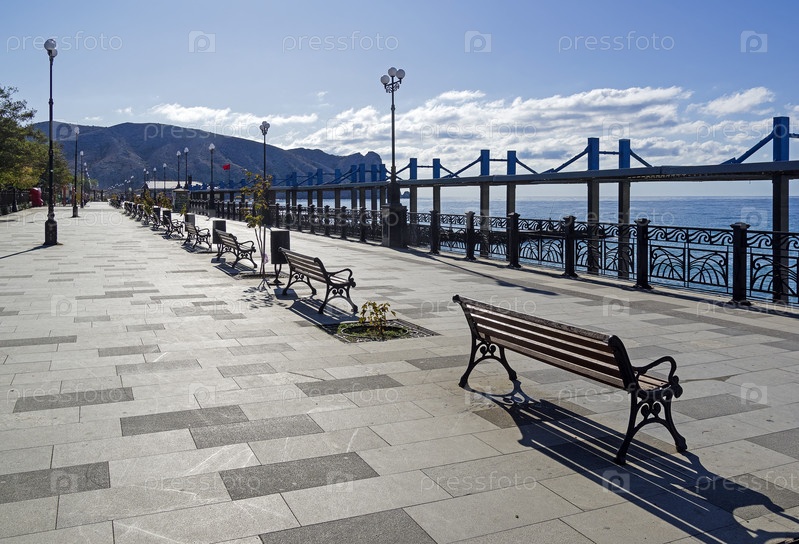 Пустая набережная в курортном городе Судак, Крым. Раннее утро, солнечный день в сентябре