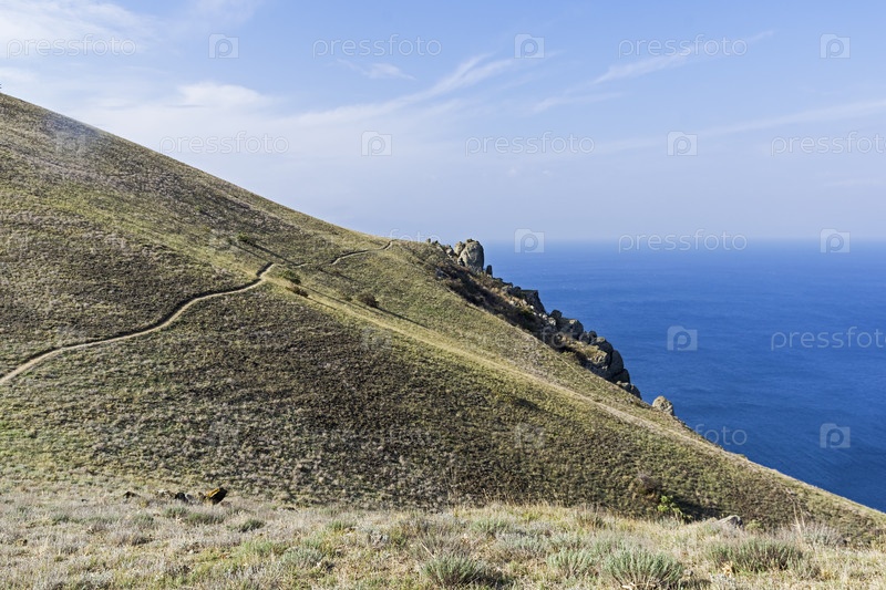 Тропинка на крутом берегу прибрежной горы. Мыс Меганом, Крым, солнечный день в сентябре