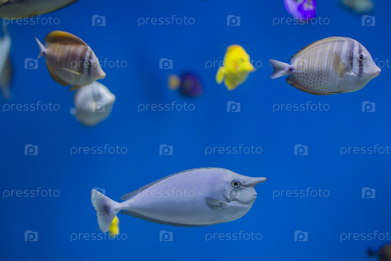 Разноцветные тропические рыбы на фоне рифов и кораллов
