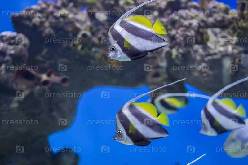 Zanclus cornutus - экзотическая тропическая рыба на фоне кораллов и рифов. стада полосатых аквариумов