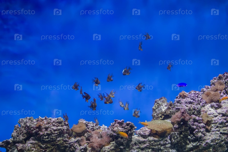 Стая тропических рыб на фоне рифов и кораллов. Экзотическая рыба в голубой воде