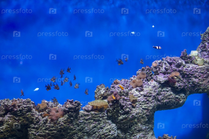 Стая тропических рыб на фоне рифов и кораллов. Экзотическая рыба в голубой воде