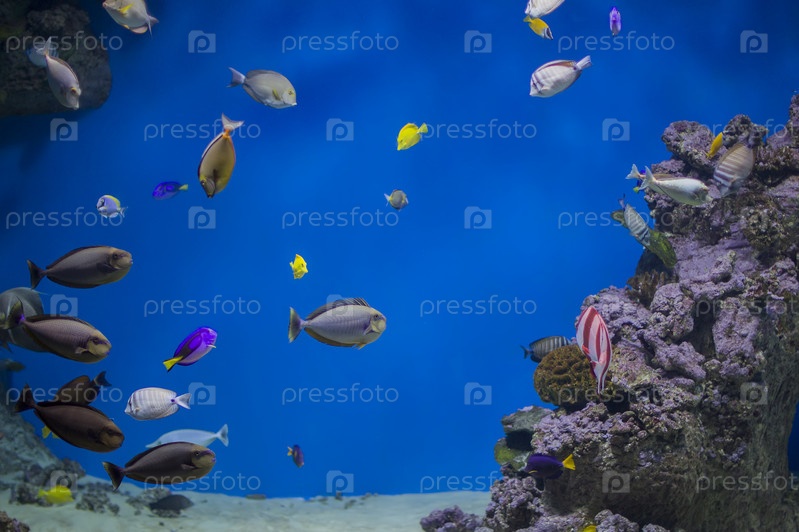 Разноцветные тропические рыбы на фоне рифов и кораллов