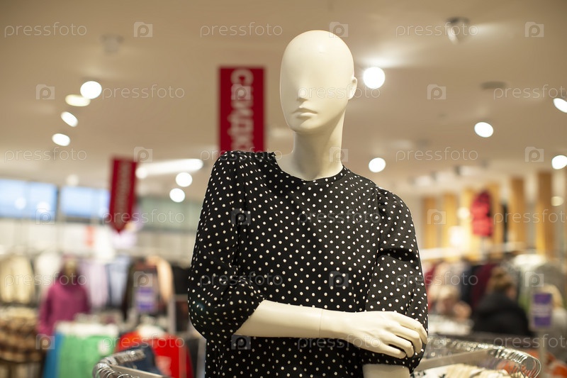 Манекены в магазине одежды красного и синего цветов. Продажа одежды