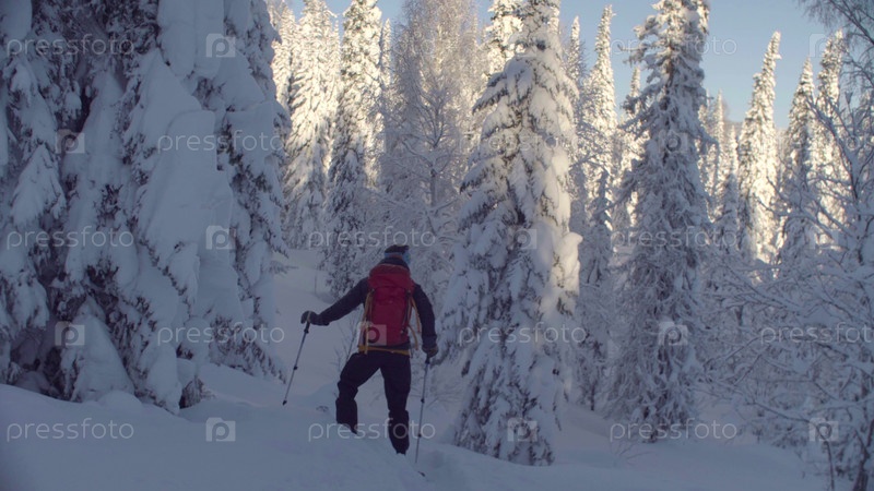 Скитур в Сибири. Мужчина катается на лыжах в заснеженном лесу, вид сзади