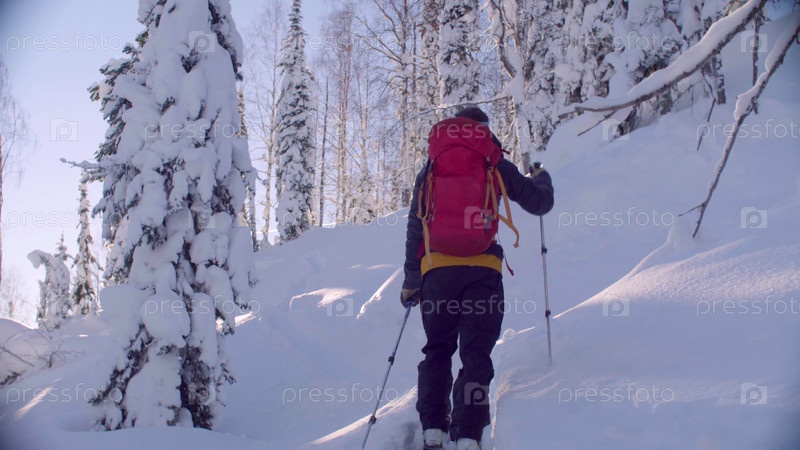 Скитур в Сибири. Мужчина катается на лыжах в заснеженном лесу, вид сзади