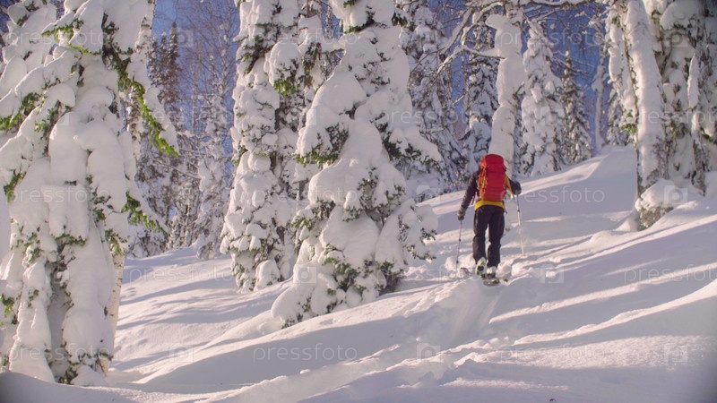 Скитур в Сибири. Мужчина катается на лыжах в заснеженном лесу, вид сзади