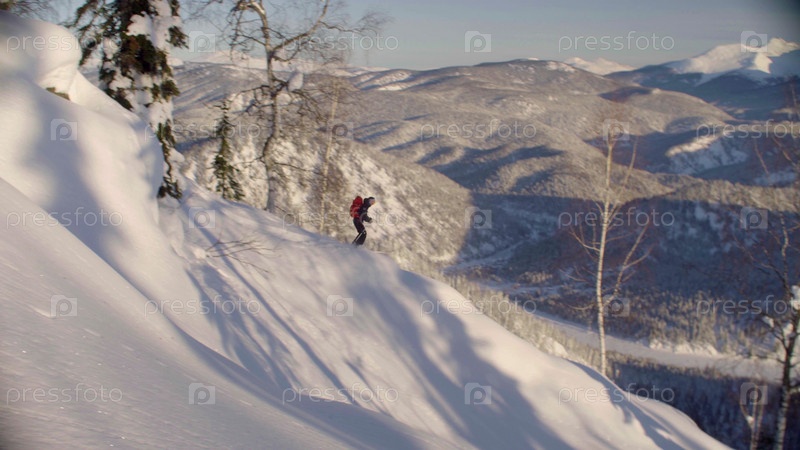 Мужчина едет вниз по склону в заснеженном лесу, вид сбоку. Фрирайд в Сибири