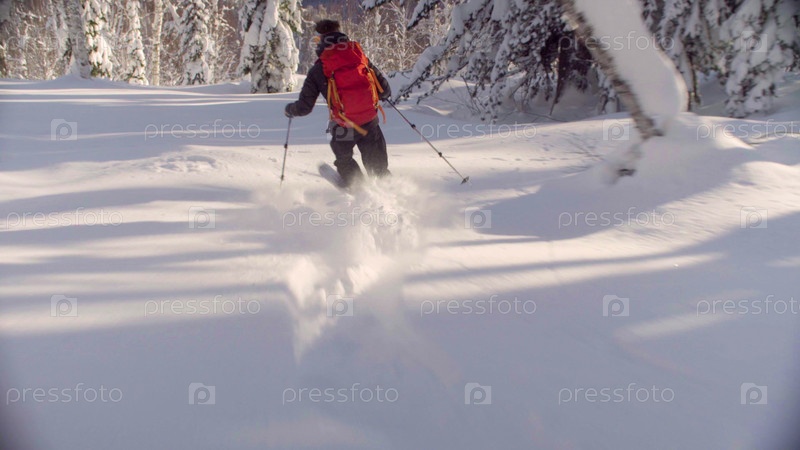 Мужчина едет вниз по склону в заснеженном лесу, вид сбоку. Фрирайд в Сибири