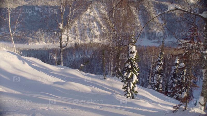 Вид на зимний лес в сибирских горах