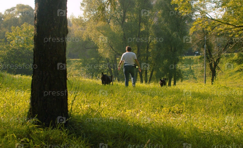 Женщина гуляет с двумя черными собаками-боксерами в парке. Лето, солнечный день