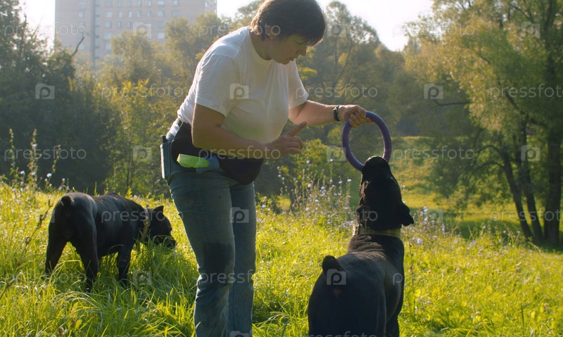 Женщина играет с черной собакой-боксером в парке. Она тянет кольцо, которое собака держит в зубах
