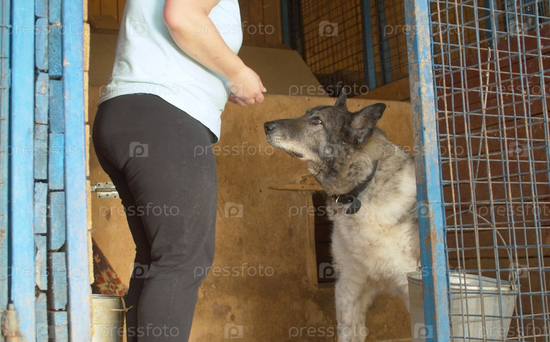 Волонтер в питомнике для собак. Приют для бездомных животных. Дворняга счастливый посетитель приюта. Женщина гладит собаку