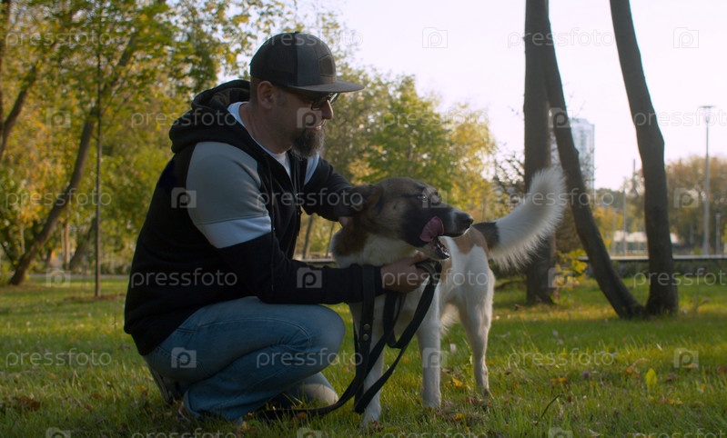Красивый мужчина средних лет со своей собакой в парке летом. Хозяин гладит собаку. Собака наслаждается этим