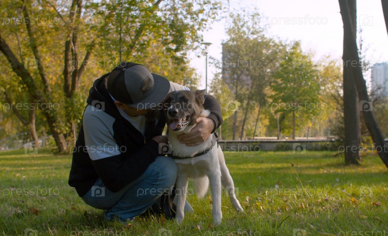 Красивый мужчина средних лет со своей собакой в парке летом. Хозяин гладит собаку. Собака наслаждается этим