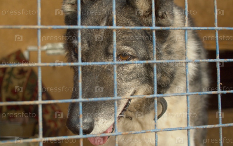 Грустное лицо лохматой собаки в клетке в приюте для животных