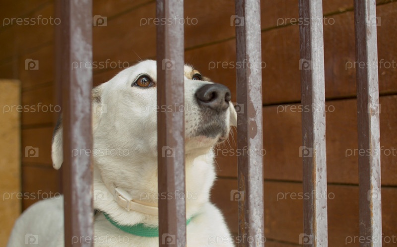 Закрыть грустное лицо умной белой собаки в приюте для животных, смотрящей через забор
