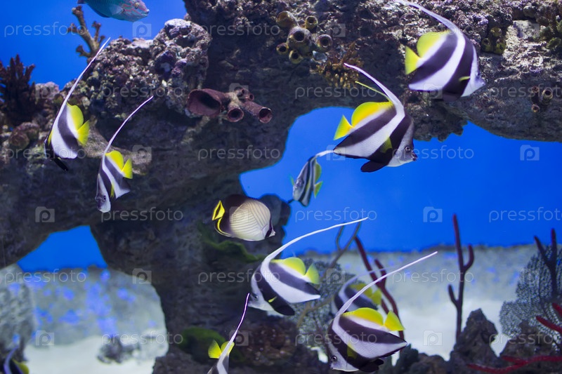 Zanclus cornutus - экзотическая тропическая рыба на фоне кораллов и рифов. стада полосатых аквариумов