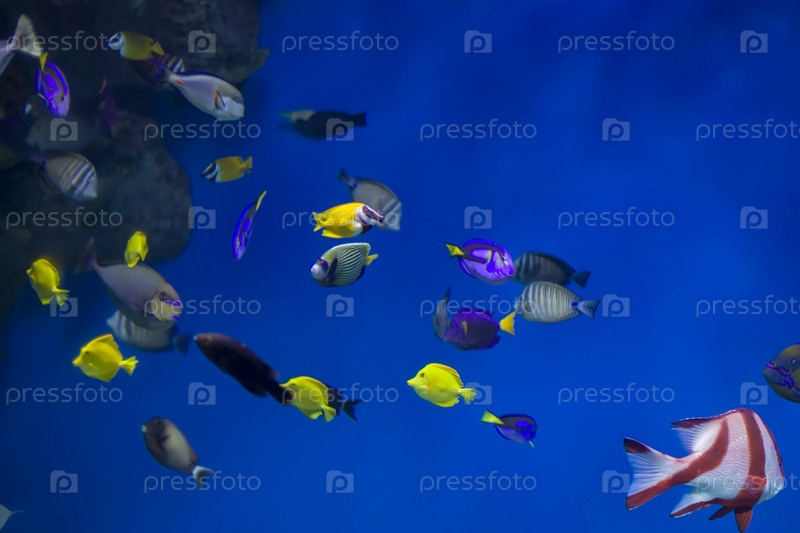 Разноцветные тропические рыбы на фоне рифов и кораллов