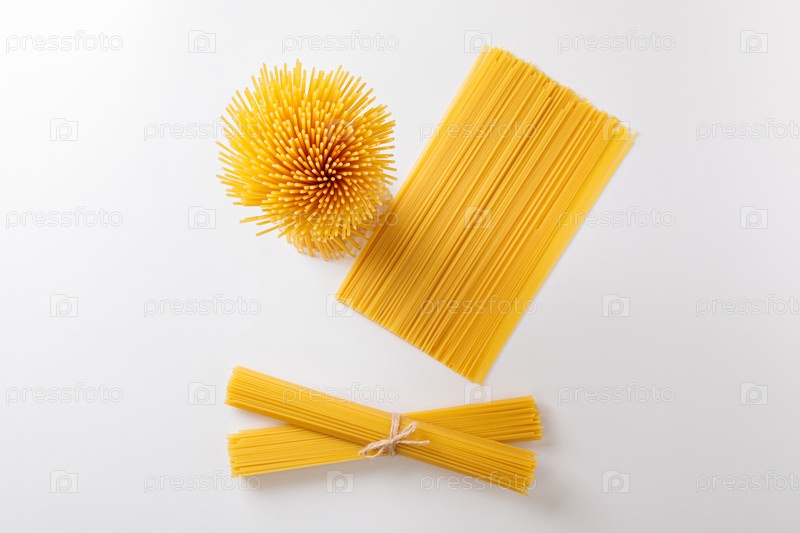 Вертикальный пучок и куча сырых спагетти, перевязанных ниткой. Связка на белом фоне. Вид сверху